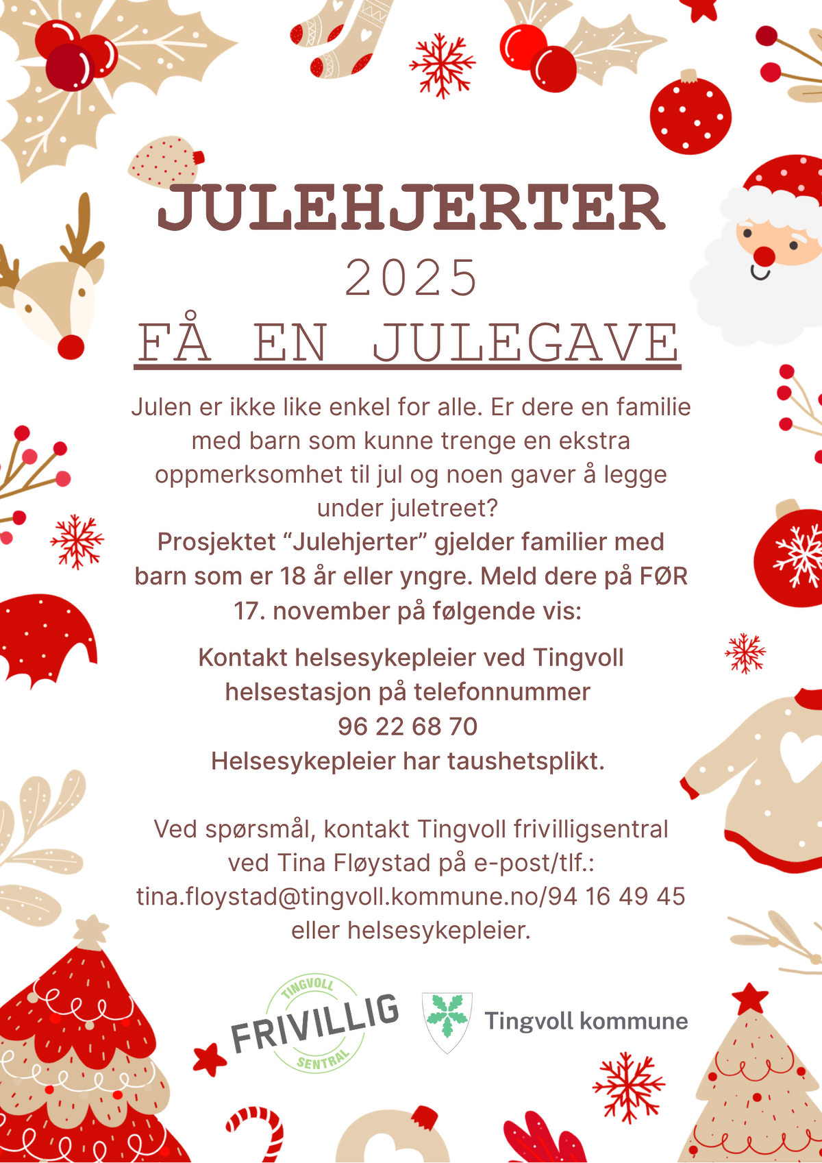 Ved spørsmål, kontakt helsesykepleier eller Tingvoll frivilligsentral ved Tina Fløystad på e-post: tina.floystad@tingvoll.kommune.no eller telefonnummer 94 16 49 45.