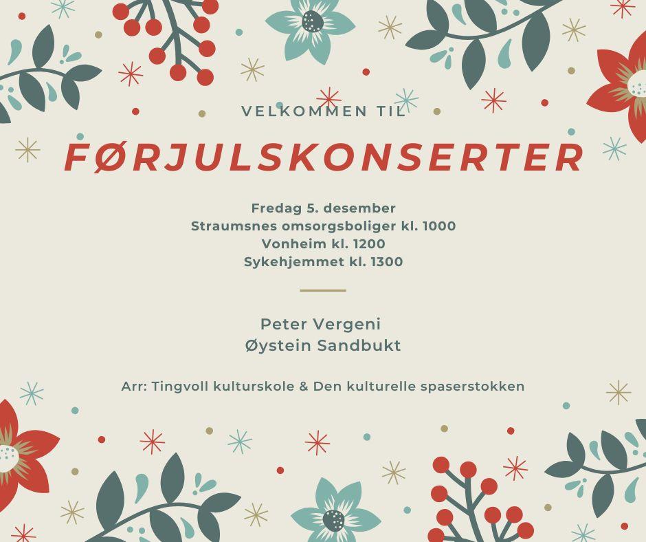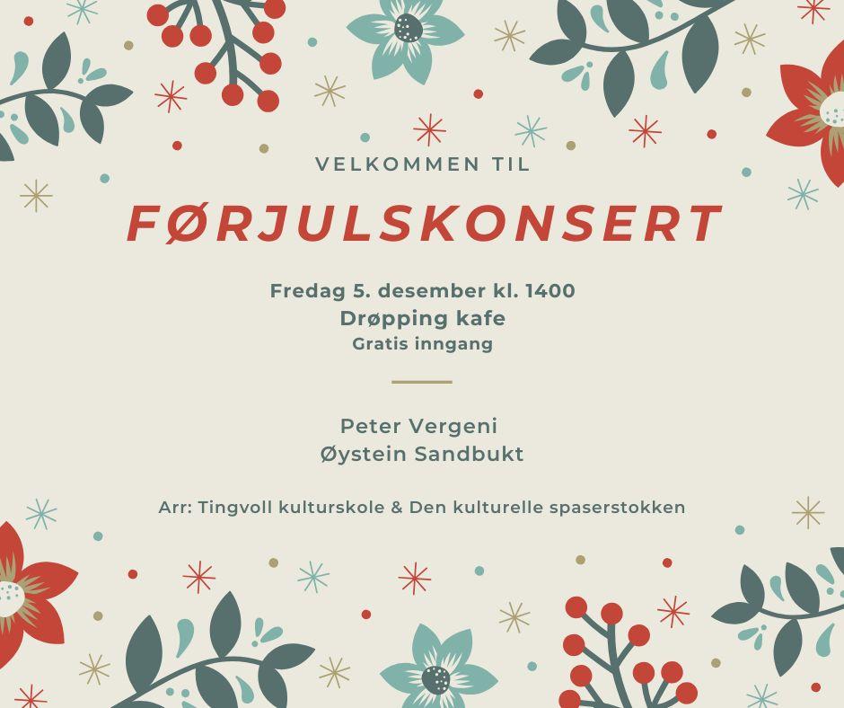 Fredag 5. desember blir det førjulskonsert på institusjonene og Drøpping kafé.Peter Vergeni og Øystein Sandbukt (for mange kjent fra gruppa Fjord og Fjell) holder konsert fredag 5. desember på Straumsnes omsorgssenter, Vonheim, Tingvoll sjukeheim og Drøpping kafé. Det er gratis inngang på Drøpping kafé.